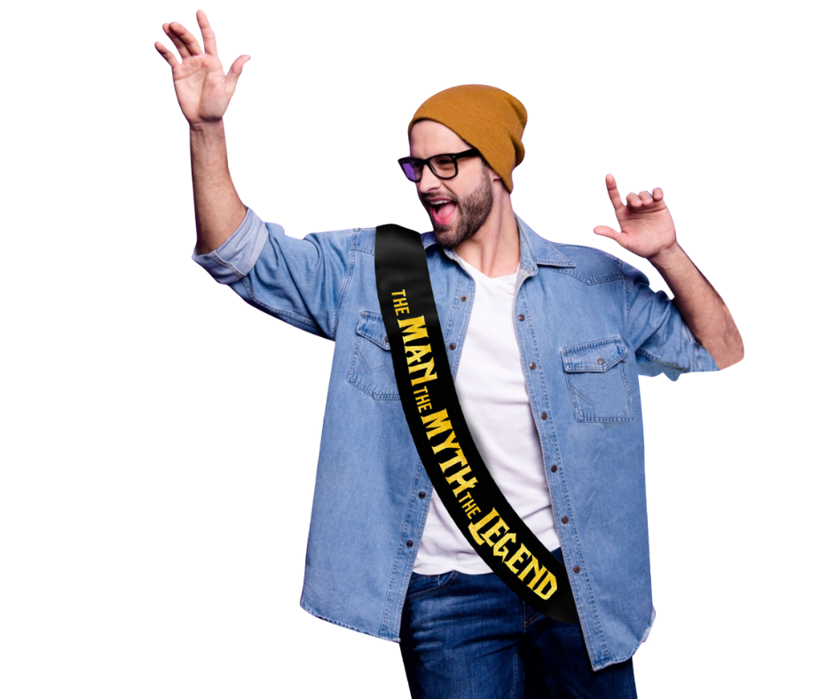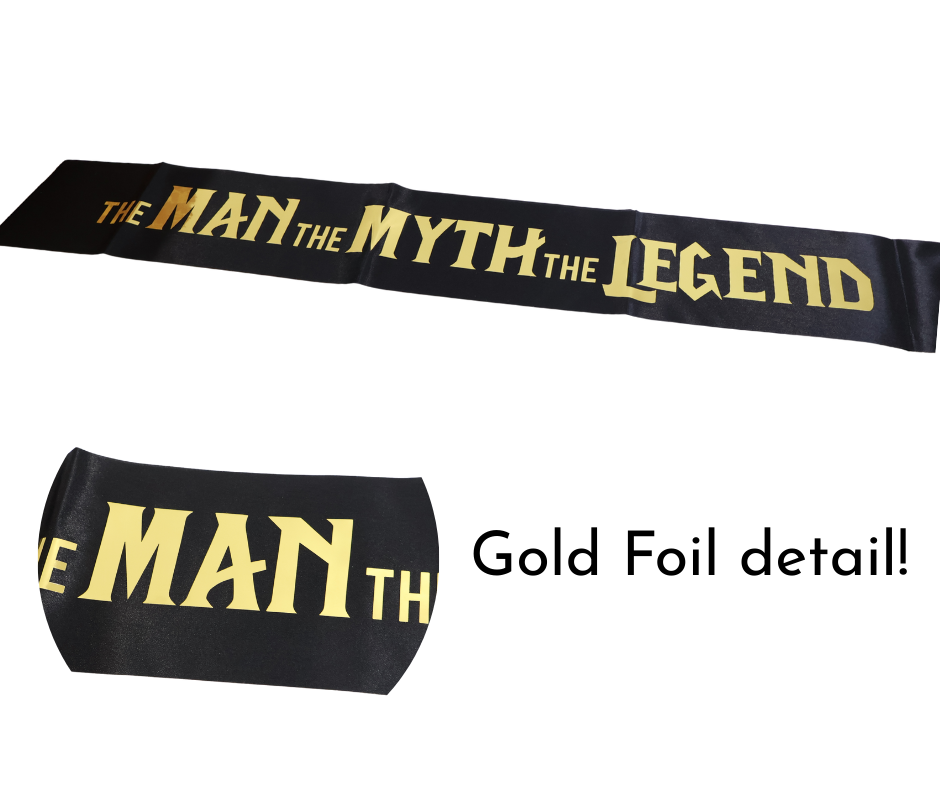 Black satin sash with bold gold lettering: “The Man. The Myth. The Legend.”
